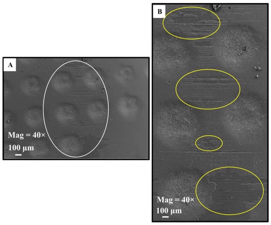 The textured specimen ECP_SC surface was analyzed on the SEM after the sliding test. There was no measurable wear on the specimen surface because the number of rotating cycles during the block-on-ring experiment was not sufficient enough to wear the specimen. However, there were traces of minor scratches, as shown in Figure 8B,C. These scratches on the textured surface were observed at the texture boundaries. Additionally, it was observed that these texture boundaries were smooth, and during the sliding interaction helped in supplying the lubricant from the texture storage area. This easy flow resulted in the reduction in COF at ML and HL regimes.