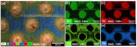 (a) SEM/EDS mapping showing the chemical composition distribution for textured and coated specimen ECP_SC_MoSeC; (b) Mo coming from the coating; (c) Se coming from the coating; (d) Cr from the coating interlayer and (e) Fe from the substrate.