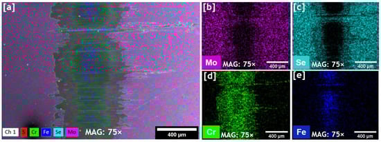 (a) SEM/EDS mapping showing the chemical composition distribution for the coated specimen MoSeC; (b) Mo coming from the coating; (c) Se coming from the coating; (d) Cr from the coating interlayer and (e) Fe from the substrate.