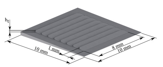 For this investigation, in addition to the smooth lubrication wedge geometry, variants with wedge-shaped texture geometries on the upper lubrication gap surface were analyzed. The lubrication gap geometry is shown in Figure 3. A parameter study was performed by varying the texture depth ht. Texture heights of 5, 10, 20, and 50 µm were used.