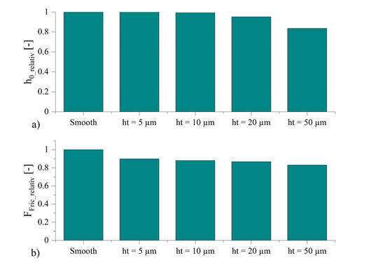 Since the external load was specified, a corresponding lubrication gap height was obtained for the different geometries (Figure 5a). The clearance height can be interpreted as a parameter for the bearing capacity. A higher value for the clearance height corresponds to a higher bearing capacity of the texture. Figure 5a shows the relative clearance heights of the lubrication gaps in comparison to the smooth wedge. It can be seen that for texture heights of 5 µm and 10 µm, the corresponding lubrication gap heights and thus the load bearing capacities of the textured surfaces were approximately the same as for the smooth surfaces. For ht = 20 µm and 50 µm, the load-bearing capacity decreased significantly. In Figure 5b, it can be seen that for all texturing heights, the hydrodynamic friction force was lower than for the smooth wedge. For texture heights of 5 and 10 µm, the friction was reduced while the lubrication gap clearance remained the same, which corresponded to an improvement in the tribological performance for the considered operating condition in the hydrodynamic lubrication regime.