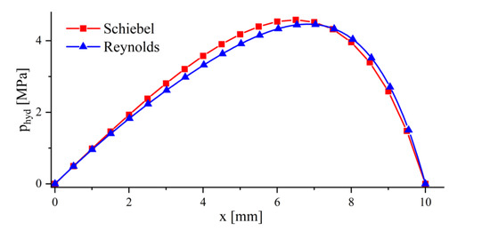 An analytical solution of the hydrodynamic pressure distribution for the smooth lubricating wedge was used to validate the implemented simulation model. For the operating condition in the hydrodynamic lubrication regime (Table 1), a clearance height of was obtained. For this lubrication gap geometry, the pressure distribution was calculated, on one hand, using the simulation model, and on the other hand, using the analytical solution according to Schiebel [41]. In Figure 6, the hydrodynamic pressure in the middle of the smooth lubrication wedge (section at y = 5 mm) is depicted. It can be seen that the difference had the highest value in the center and decreased continuously toward the edges. The average deviation between the simulation model and analytical solution was ~1.9%. However, due to the small difference, the correct implementation was ensured.