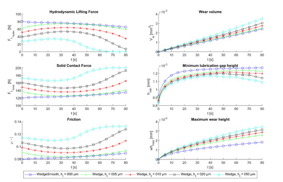 In Figure 7, the simulation results for the wear calculations in the mixed friction regime are shown. The characteristics of the hydrodynamic lifting force FL_Hydro, solid contact force FL_Solid, friction coefficient µ, wear volume VW, minimum lubrication gap height hmin, and the maximum wear height whmax, depending on the time in mixed friction of the smooth lubrication wedge, were compared with those of the textured variants with different texture heights. Selected textures exhibited beneficial tribological performance in the hydrodynamic friction regime (Figure 5). It was evident for all textured variants that in the initial condition, for the operating point in mixed friction (Table 2), lower hydrodynamic lifting forces and higher solid contact forces were determined, resulting in a higher coefficient of friction. Even the textured surfaces exhibited lower friction coefficients for the considered operating point in the hydrodynamic lubrication regime. In the case of the smooth wedge, the hydrodynamic lifting force decreased successively with increasing time in mixed friction, which was related to the wear in the lubrication gap and the associated change in the lubrication gap geometry toward a parallel gap. For the textured surfaces, an intermediate increase in the hydrodynamic lifting force was evident before it rapidly decreased with increasing wear. Furthermore, it was observed that the textured surfaces showed higher wear values, even if they showed better performance in the hydrodynamic lubrication regime. Neither the maximum wear height nor the wear volume showed an advantageous trend compared to the smooth lubrication gap.