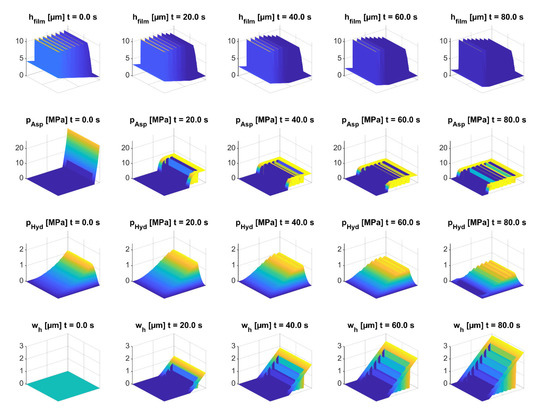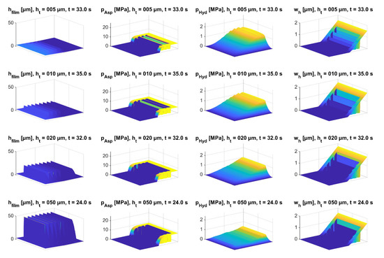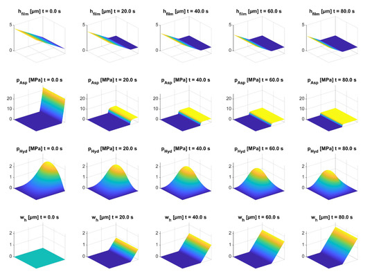 In Figure 8, the wear−dependent parameters of the lubrication gap are shown as surface plots. The superposition of the smooth lubrication wedge (α = 0.02°) with the texturing was evident by the lubrication gap height hfilm in the initial state (t = 0). In the initial state, the smallest lubrication gap height hmin was very localized at the outlet end of the lubrication gap. With an increasing time in mixed friction, the wedge became increasingly flattened, whereby the minimum lubrication gap height occurred in larger areas and reached a higher value (compared with Figure 7). This was also evident with the development of the asperity contact pressure. In the initial condition, high asperity contact pressures could be observed at the edge along the clear height h0. This area was rapidly worn due to the high asperity contact pressures (according to Equation (6)). The wear led to areas with the same lubricating gap heights. As the wedge effect decreased, it can be seen that the hydrodynamic pressure buildup was reduced. The pressure buildup due to the separate texturing can be seen in Figure 8. With increasing wear, the proportion of the pressure buildup of the texturing increased in relation to the pressure buildup of the main lubrication wedge. The plot of the wear height showed that the lubricating wedge mainly was subject to wear and the texture, due to its depth, remained almost unaffected.