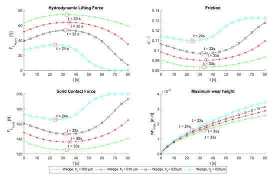 In Figure 9, the parameters for the smooth lubrication gap are depicted in relation to the time in mixed friction. The results showed that with increasing wear, the wedge geometry was reduced. As a result, the hydrodynamic pressure peak shifted, and the magnitude of the hydrodynamic force decreased (compared with Figure 7).