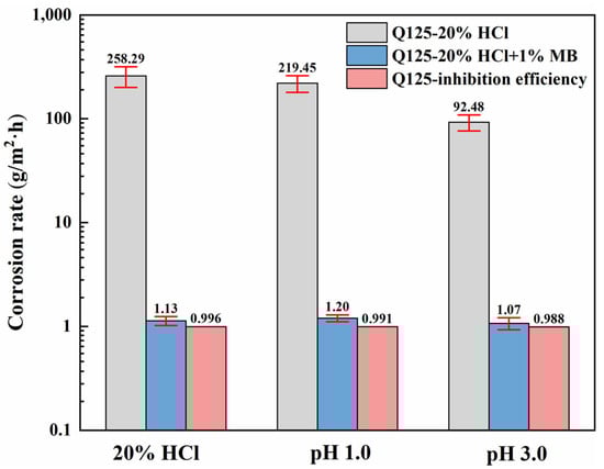 Figure 2 shows the weight loss results of casing steel in fresh and residual acid solutions with and without Mb inhibitor. The study determined that when there was no Mb inhibitor, the corrosion rate decreased as the hydrogen ion concentration in the solution decreased. However, even when the pH of the solution was 3.0, the casing steel still had a higher corrosion rate of 92.48 g m−2 h−1. When Mb appeared, Mb could effectively inhibit the occurrence of uniform corrosion of casing steel. Although the corrosion inhibition efficiency decreased slightly as the hydrogen ion concentration of the solution decreased, it still had a higher corrosion inhibition effect, and the corrosion inhibition efficiency was 98.8% under the condition of pH 3.0.