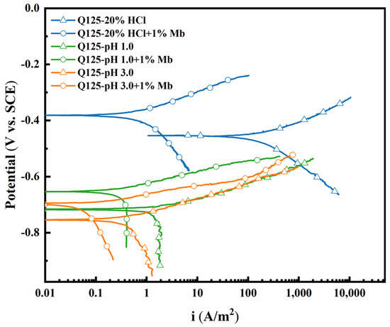 The polarization curves of casing steel in fresh and residual acid solutions with and without Mb inhibitor for 4 h are shown in Figure 3. Under the condition of fresh acid, the appearance of Mb inhibited the anodic reaction and cathodic reaction of casing steel. The appearance of Mb caused the OCP to move up. Under the condition of residual acid, the OCP was significantly lower than that under the condition of fresh acid, and with the decrease in hydrogen ion content, the OCP decreased. When the corrosion inhibitor appeared, it could also inhibit the anode process and cathode reaction process, and the appearance of the corrosion inhibitor caused the OCP to move up, which was the same as that in the fresh acid condition, but the cathode reaction process in the residual acid condition was controlled by activation and diffusion. Compared with the condition of pH 3.0, the inhibition effect of Mb on the anodic reaction was more obvious at pH 1.0.