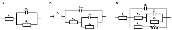 Fitting circuit of EIS results in Figure 4. Note: (a) 20% HCL, pH = 1, and pH = 3; (b) 20% HCL + Mb and pH = 3 + Mb; (c) pH = 1 + Mb.