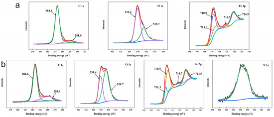 The XPS results of C, O, Fe, and N elements of casing steel in hydrochloric acid solution with or without Mb at pH 3.0 are shown in Figure 8. The residual peak of C 1s at 284.6 eV was used to calibrate the binding energy of each substance. In the residual acid solution without Mb, the peak of C 1s, O 1s, and Fe 2p3/2 was at 288.0 eV, 531.4 eV, and 711.3 eV, respectively, indicating the appearance of FeCO3 [21]. The peak of O 1s at 529.7 eV, the peak of Fe p3/2 at 710.9 eV and 718.7eV, and the peak of Fe 2p1/2 at 724.5 eV corresponded to Fe2O3 [22]. When the Mb was added, the binding energy of C, O, and Fe elements was the same. In addition, the peak of N 1s was at 399.0 eV, which might be related to the residual Mb on the surface of the substrate or the corrosion products from the interaction between the Mb and the substrate.