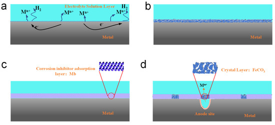 Corrosion/corrosion inhibition mechanism model diagram: (a) fresh acid; (b) residual acid; (c) fresh acid with Mb; (d) residual acid with Mb.