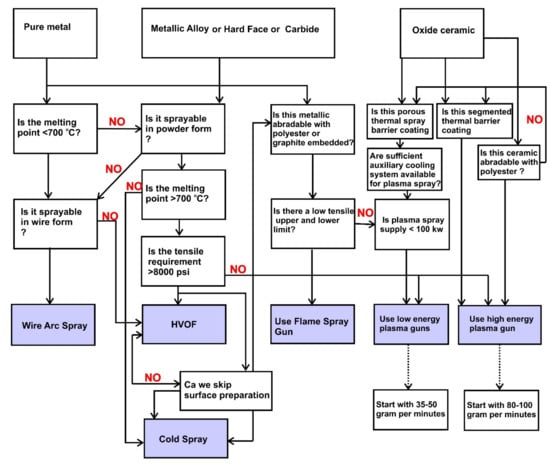 The aspects discussed in Section 2 and Section 3 were valid primarily for the plasma spray, HVOF, and flame spray processes and hence can be used as a framework to develop a recipe for parameter development. Cold spray, by virtue of being a kinetic energy driven process, is not discussed extensively in this article, but a similar type of rationale can be drawn for this variant of spraying.
