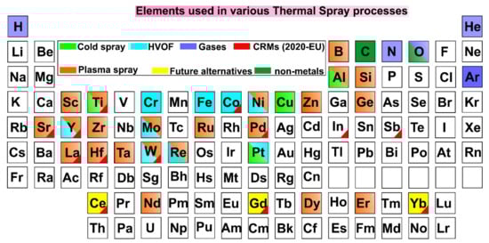 Elements in the periodic table that are typically preferred for different spraying routes. Uncoloured elements are those which are yet to find their space in the thermal spray ecosystem (author’s own contribution).