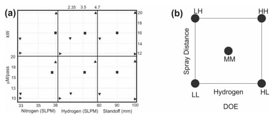 (a) Matrix plot of parameters vs. two important coating requirements (kW and m/pass). (b) A DOE with five finalised trials with LL (low hydrogen, low spray distance), LH (low hydrogen, high spray distance), HL (high hydrogen, low spray distance), HH (high hydrogen, high spray distance), and MM (medium hydrogen, medium spray distance)—author’s own work.