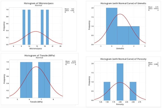 Based on the DOE in this case, it is easy to decide the standoff distance should be 100 mm with five standard litres per minute (SLPM) hydrogen. The next steps involve repeatability checks and analysing whether all the desirable properties, such as porosity and tensile strength, meet the target specifications. As shown in Figure 6, a histogram plot showing properties such as porosity, unmelts, thickness/pass, and tensile strength could help to identify if the process is within the compliance window. It is important to publish a range instead of a specific number, for users to achieve the target specifications without any difficulties. Hence, it is important to obtain the mean, median, and standard deviation from such repetitive studies (see Table 2).
