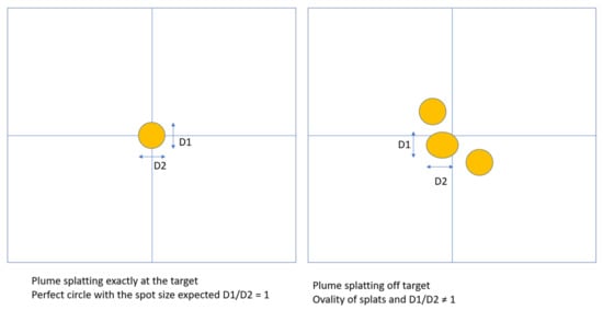 Figure 8 reveals the spot location concerning the target crosshair on the flat plate. If the spots shoot exactly at the target, both the robot tool centre point (utool in the Fanuc robot terminology), or the tool centre point (TCPF in ABB robot terminology), it means that the nozzle/injector is in a good condition. Sometimes, even with new hardware/injector replacement, there is a possibility of the spot size being off target. The reason could be a damaged gun mount or an inaccurate tool centre point. It is good to involve a robot programmer at that stage, to modify the tool centre point coordinates, to bring back the spot to the target. The ovality of the particle plume can be caused either by a worn-out injector or by the carrier gas pulsing and must be corrected appropriately.