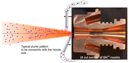 The choice of nozzle plays an important role in developing coating parameters. It can be quite confusing to think about what nozzle to start with. The selection is constrained by the gun itself. Several nozzles can be chosen for the same gun. For example, the Metco 3MB gun, can accommodate G, GP, GH, and GE nozzles. These nozzles have different exit diameters, and the converging divergent designs are suited for high-velocity, high-temperature particle choices. For example, a GP nozzle is suitable for spraying WC–Co at a high velocity with Ar/H2 gas, while a G nozzle is good for low-velocity/high-temperature particle states, for a ceramic coating such as YSZ.
