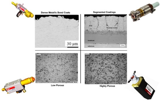 The gun arsenal and their capability to produce microstructures: dense metallic bond coat (HVOF DJ2600 gun), segmented coatings (Plazjet 200 kW gun), low porous TBC (9MB gun), and high porous TBC (F4MB gun) [38,39,40,41].