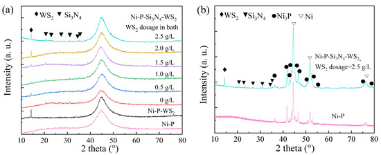 The plating bath was prepared according to its formula. Then, the required mass of WS2 and Si3N4 powders were weighed and ultrasonically dispersed in 20 mL of distilled water with an appropriate amount of surfactant for 15 min. After the pretreatment of the substrates was finished, the prepared suspension of nano-powders was added to the plating bath within 1 min at a uniform rate. Subsequently, the substrates were immersed in the bath for plating. Mechanical stirring was used with a fixed speed of 250 rpm, and the plating duration was 2 h. During the plating process, the pH value of the bath was adjusted with a dilute sulfuric acid solution (1 mol/L) every 20 min. Finally, six groups of samples with different WS2 contents were prepared. For the purpose of comparison, a pure Ni-P coating and a Ni-P-WS2 coating (WS2 dosage = 2.5 g/L in bath) were also prepared.