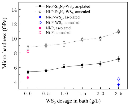 Figure 4 shows the dependence between the micro-hardness of the coatings and the WS2 dosage in the bath before and after heat treatment. At the as-plated state, the hardness of the Ni-P coating was 4.6 GPa, while the Ni-P-WS2 coating demonstrated a relatively lower hardness (3.6 GPa), the possible reason for which can be attributed to a loose morphology of the Ni-P-WS2 coating (see Figure 2f) and the low strength of WS2 particles, causing the coating’s strength to decrease. When Si3N4 and WS2 particles were simultaneously added to the bath, the hardness of the Ni-P-Si3N4-WS2 coating was remarkably higher than that of the Ni-P-WS2 coating, which is mainly due to the high strength of Si3N4 particles. Furthermore, with the increase in WS2 dosage, the agglomeration level of WS2 particles on the coating’s surface decreased, and the microstructure of the coating became finer. Therefore, the synergism of Si3N4 and WS2 powders made the coating denser and the microstructure finer, so the hardness of the coating showed an upward trend and reached the highest value of 7.2 GPa at a WS2 dosage of 2.5 g/L. The fine-grain strengthening effect played a main role in the progressive increase in the coating’s hardness.
