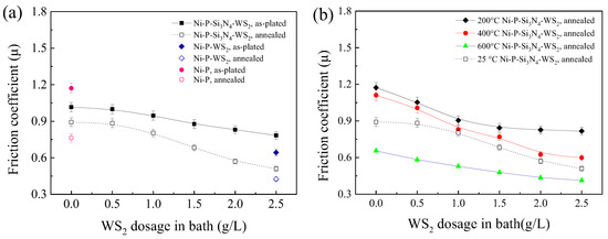 Dependence of the friction coefficient of Ni-based coatings on WS2 dosage in bath: (a) at room temperature and (b) at 200, 400, and 600 °C (the data at R.T. are also included for comparison).