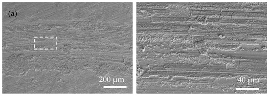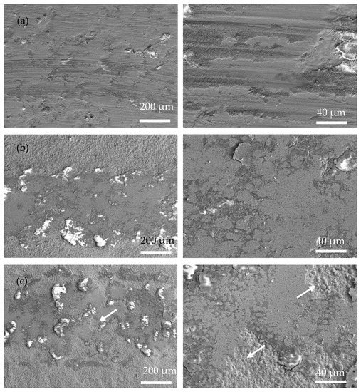 Figure 7 shows the SEM wear morphology of the annealed coatings. Compared with that of the as-plated coatings, the area of the wear mark is smoother, with fewer cracks and plowing marks. The wear mechanism is mainly an abrasive polishing effect. Due to the obvious increase in the hardness of the annealed coating, the actual contact area between the coating and the ceramic ball became smaller during the friction process. Therefore, the depth and width of the wear mark are smaller than those of the as-plated coating, suggesting a better anti-wear property of the annealed coating. In addition, a large number of original surfaces appear in the wear mark area (marked with white arrows in Figure 7c–e), further proving that relatively slight wear occurred in the annealed coating.