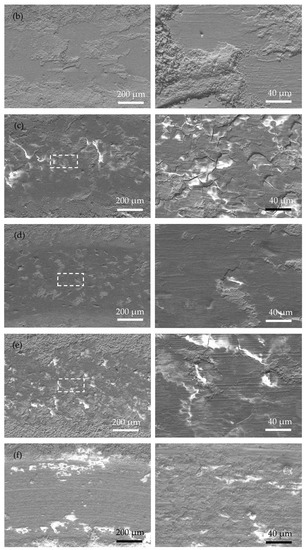 Figure 6 shows the SEM surface morphology of the as-plated coatings after wear tests were carried out at room temperature. In Figure 6a, the scratch contour produced by the plowing of a ceramic ball is clear on the surface of the Ni-P coating. There are some peeling pits of wear debris in the wear mark area, and the furrow and adhesion effects of the sample are obvious, suggesting a typical adhesive wear characteristic. Compared with the Ni-P coating, the scratches on the Ni-P-WS2 coating’s surface (Figure 6f) are relatively finer, the wear mark is much wider, and more debris is accumulated. In Figure 6b–e, the wear debris is paved on the coating’s surface under the rolling of the ceramic ball (spalling occurs in local areas due to poor adhesion of the debris to the coating’s surface), and almost no coarse scratches are observed. The form of wear is mainly adhesive wear, with a polishing effect of nano-particles, which is the result of the synergetic action of WS2 and Si3N4 nanoparticles. When in contact with the counterpart ball, the particles that were loosely bonded to the coating’s surface first fell off. After the WS2 particles peeled off, they spread on the coating’s surface to form a lubricating layer, while Si3N4 played the role of abrasive polishing as a hard phase. The synergetic action of the two phases enhanced the friction performance of the coating [38]. Table 3 shows the chemical composition of the area of the wear mark (labeled with a white box in Figure 6). Compared with the original surface of the coating, the oxygen content in the wear mark area increased significantly, indicating that there was a lot of Ni oxide at the wear mark after wear tests, due to the tribo-chemistry effect in an ambient atmosphere.