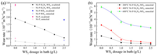 Wear rate of Ni-based coatings with WS2 dosage in bath at various operating temperatures: (a) room temperature; (b) 200, 400, and 600 °C.