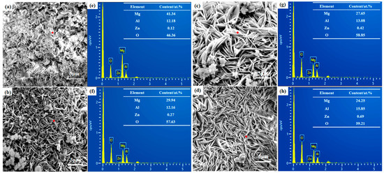 The SEM morphologies and related EDS spectra of ZnAl-LDH films grown on substrates with different roughness are plotted in Figure 2. The different surface roughness of the substrates has a great influence on the growth morphology of the films. Figure 2a–d shows the typical flake-like nanosheets of LDH films. It is worth noting that the surface with high roughness has some protrusions in the whole film layer, and the grown LDH nanosheets are more sparsely distributed and smaller in size. As the surface roughness value Sa decreases, the size of LDH nanosheets gradually increases, and the films become denser. This may be because the magnesium matrix with high surface roughness has a large surface area and more grain boundaries, and the grain boundaries and grain positions formed by protrusions are different, which provide more nucleation sites for the growth of ZnAl-LDHs, resulting in different Mg dissolution rates and ZnAl-LDH film nanosheet growth rates, and thus different film thicknesses at corresponding locations [26]. In order to better compare the content of each element in the films, the carbon measurement peaks are hidden from the EDS analysis. The position of the point scan is marked in red. The results show that the elements composing ZnAl-LDH films are mainly Mg, O, Zn, and Al, indicating the presence of ions suitable for the preparation of LDHs films. The content of Mg2+ decreases as the surface roughness Sa decreases because the smoother the surface the smaller the interface for the magnesium matrix to participate in the reaction. However, the ratios of Zn/Mg and Al/Mg are too low, indicating that the in situ growth of the film is thinner, and Mg2+ is mainly derived from the Mg matrix.