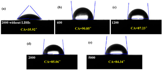 Water contact angle for bare and coated ZnAl-LDHs film samples: (a) 2000 (without LDHs); (b) 600; (c) 1200; (d) 2000; (e) 5000.