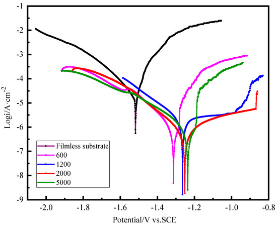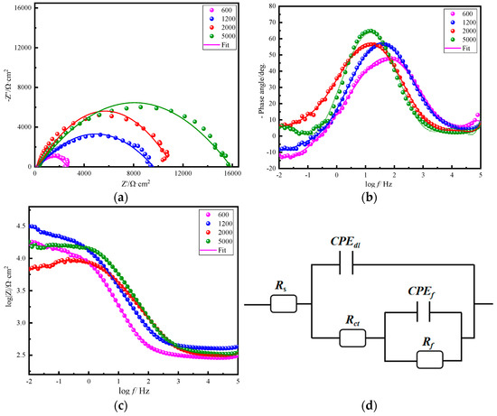To characterize the protective effect of the thin films on the magnesium AZ91D alloy, the EIS method was employed. It can be seen from Nyquist diagram that the impedance spectrum of ZnAl-LDH film consists of a high-frequency capacitive impedance arc and a low-frequency capacitive impedance arc. The capacitive impedance arc at high frequency is related to the capacitance and resistance of the film layer, whereas the low frequency capacitive impedance arc is related to the capacitance and charge transfer resistance of the electrical double layer. The sample treated with the 5000 sandpaper has the largest impedance radius arc, indicating that it has the best corrosion resistance. The EIS spectra may show one, two, or more time constants depending on the single or multi-layer structure of the films, whether the films are porous or compact, whether the space-charge zone limits the charge transfer forms of the potential used, or the charge transfer process is affected by diffusion. Two well-defined time constants can be seen from Figure 8. The relaxation process at high frequencies is attributed to the porous layer and another low frequency attributes to the internal dense layer. Of these, Rf represents the membrane resistance, Rs represents the solution resistance, Rct represents the membrane-substrate interface, CPEdl describes the double layer capacitance at charge transfer resistance, and CPEf represents the capacitance of the bilayer at the interface between the electrode and the electrolyte solution. Electrochemical parameters for the equivalent circuit diagram fitting are shown in Table 2. The thin films of ZnAl-LDHs (600, 1200, 2000, 5000) have transfer resistance fractions of 331.4, 390.3, 424.7, and 512.5 Ω·cm2, respectively. Thus, the flatter the initial surface is the smaller the roughness is, and the ZnAl-LDH film grown on the surface has a higher charge transfer resistance, i.e., the resistance of the charge flowing through the film to the substrate increases, and the double-layer capacitance of the ZnAl-LDHs film (5000) is the smallest, only 1.78 × 10−6 F/cm2. Therefore, the ZnAl-LDHs film grown on the surface of the magnesium alloy processed by 5000 sandpaper has the best corrosion resistance on the magnesium alloy.