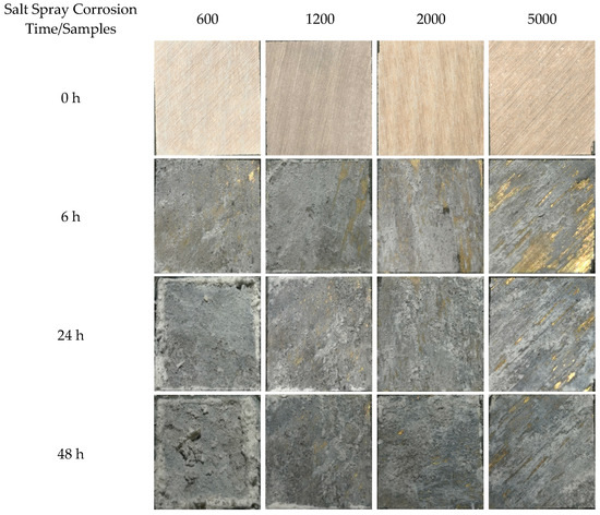 The surface state of the neutral salt spray test of the samples at 0, 6, 24, 48 h.