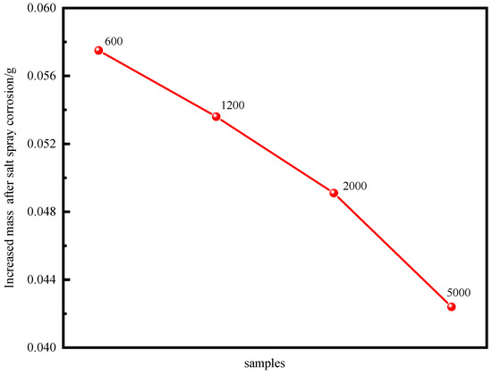 The surface corrosion state of the neutral salt spray test of the ZnAl-LDH films grown on AZ91D magnesium alloy with different surface roughness at 0, 6, 24, 48 h is shown in Figure 9. As the neutral salt spray time was extended, white corrosion products appeared on the surface of each of the samples, and the amount of corrosion products was continuously increased. When the neutral salt spray time reached 48 h, the increased mass of the samples following corrosion gradually decreased as the surface roughness decreased, as can be seen in Figure 10. The sample mass processed by 5000 sandpaper was only increased by 0.0424 g. These results indicated that the surface roughness had a large influence on the corrosion resistance of neutral salt spray. In general, the smaller the surface roughness of the specimens the better the corrosion resistance of the ZnAl-LDHs film that is grown on the surface, and the greater the surface roughness of the specimen the more severe the corrosion resistance. Because of the larger the roughness of the sample surface, condensation is more easily formed on the surface in the salt spray test process, leading to corrosion of the surface. Additionally, the greater the surface roughness the greater the real surface area of the part’s surface and the more salt spray contact, thus making it easier to corrode. Simultaneously, in the salt spray test, the smaller the surface roughness of the workpieces the fewer chloride ion residues on the surface and the better the corrosion resistance.