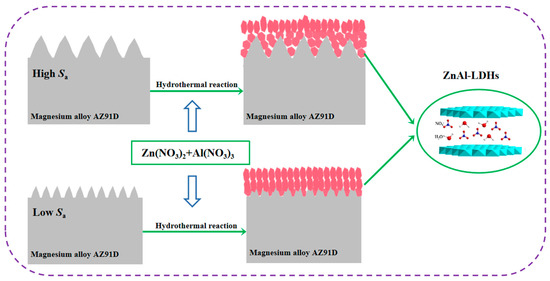 Although a great deal of work has been performed on the preparation of 2D nano-LDH films, the mechanism of their formation remains controversial. The two accepted growth mechanisms of LDH films are ion substitution theory and dissociation-sediment-diffusion theory. Figure 11 depicts the mechanism of in situ growth of ZnAl-LDH thin film on magnesium alloy surface. Its growth may be consistent with dissociation–sediment–diffusion theory mechanisms [6]. First of all, Al3+ and Zn2+ react with sodium hydroxide in solution and nucleate uniformly in solution to form metastable intermediate products layered basic aluminum nitrate and basic zinc nitrate crystal nuclei. Then, at a suitable pH, the basic aluminum nitrate and basic zinc nitrate crystal nuclei are adsorbed on the substrate. With the prolongation of crystallization time, ZnAl-LDH grains continue to grow and finally form a staggered nest-like LDH film [27]. The distribution of the LDH nano-sheet formed on the surface of magnesium matrix with high roughness is sparse, and the film thickness is small. On the other hand, the LDH nanoflakes grown on the surface with low surface roughness are uniform in size and compact and thick in thickness. This should be related to the surface bulge of magnesium matrix with high surface roughness. The bulge increases the reaction surface area, and the formed grain boundaries and grain positions are different, which provides more nucleation sites for the growth of LDHs, resulting in differences in the growth speed and direction of the LDH thin film nanoflakes, and thus the film thickness is different everywhere [28,29]. It should be noted that the current formation mechanisms are simplistic. The actual process in an aqueous solution is much more complex and is influenced by the concentration, temperature, pH, and alkalinity of the solution. Therefore, further study of the formation mechanism of LDHs will be an important research topic.