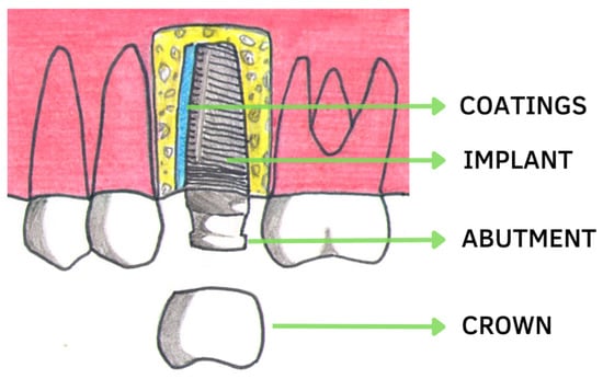 All implants are constituted of three basic components: the body of the implant (fixture), the abutment, and the abutment screw. A schematization of the implant fixture with the coating is presented in Figure 1. Macroscopically, implants can have various geometries, including threaded or tapered forms [7,9].