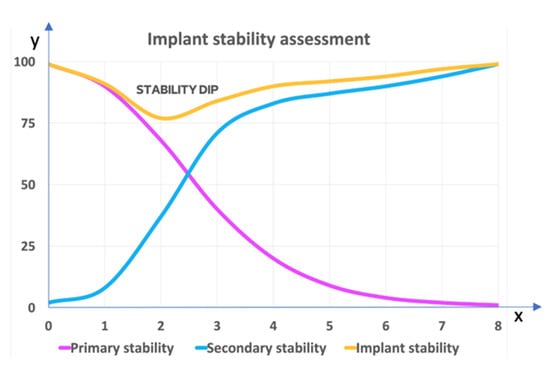 Implant stability assessment. X axis: weeks. Y axis: stability (%). Primary stability (purple) and secondary stability (blue) respectively decrease and increase, according to the curve in the graph. The yellow curve indicates total stability, with a dip after the first two weeks. The bone-to-implant contact (BIC) is a well-established technique to assess the degree of osseointegration and the speed of healing of dental implants.