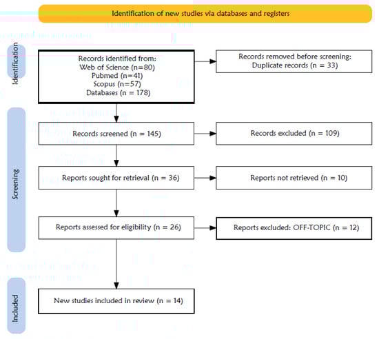 A total of 178 publications were identified from the PubMed (41), Scopus (57) and Web of Science (80) databases, resulting in 145 articles after the removal of duplicates (33). Analysis of the title and abstract resulted in the exclusion of 109 articles as being off topic, because they were not related to the use of graphene in implant dentistry. The writers successfully retrieved the remaining 36 papers and evaluated their eligibility. The approach resulted in the exclusion of 12 articles for being off topic. The evaluation finally resulted in the inclusion of 14 papers for qualitative analysis (Figure 3; Table 1).