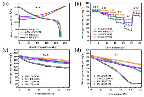 - Ma, S.; Zhang, X.; Li, S.; Cui, Y.; Cui, Y.; Zhao, Y.; Cui, Y. In situ formed LiNi0.8Co0.1Mn0.1O2@LiF composite cathode material with high rate capability and long cycling stability for lithium-ion batteries. Ionics 2020, 26, 2165–2176. [Google Scholar] [CrossRef]