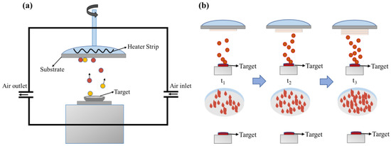 The diagram of preparing mineral anti-fog film materials. (a) Device diagram of vacuum evaporation coating machine; (b) growth of films with different thicknesses.