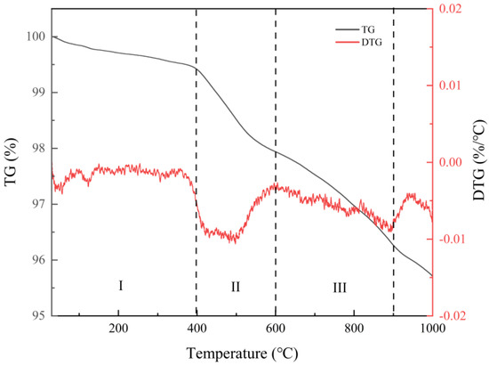 The thermogravimetric analysis of the coated raw material shown in Figure 2 indicates that the weight loss of the sample was under 400 °C. From 400 °C, the thermogravimetric curve of the sample drops sharply. There is a noticeable peak of heat absorption in the temperature range of 400–600 °C. The weight loss of the sample at this time is mainly due to the detachment of interlayer water and bonded water, but the crystal structure does not change. The weight of the mineral continues to drop at 600–850 °C. At this stage, the combined and interlayer water is gradually detached from the sample while the crystal structure of the mineral is maintained. At 850–950 °C, there is another central valley of heat absorption. At this point the detachment of the combined and interlayer water ends and the crystal structure of the mineral is altered. The sample mass loss measured over the entire test temperature was 4.30%. Through the thermogravimetric analysis of the coating material, it is speculated that the structure of the coating material will change in the vacuum evaporation coating. This provides a reference for evaporation coating.