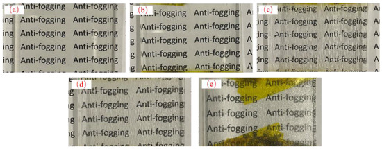 Anti-fog effect of film samples with different film thicknesses: (a) 100 nm; (b) 200 nm; (c) 400 nm; (d) 800 nm; (e) 1000 nm.