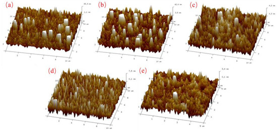 AFM images of thin film samples with different film thicknesses: (a) 100 nm; (b) 200 nm; (c) 400 nm; (d) 800 nm; (e) 1000 nm.