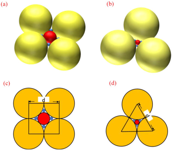 In preparing hydrophilic mineral films by vacuum evaporation, how the mineral particles accumulate on the substrate surface influences the roughness of the film and, thus, its hydrophilicity. During the evaporation of mineral particles, the size, shape and distribution of the particles influence the effect of the film deposition. As mineral particles of different shapes and dimensions are randomly deposited on the surface of the substrate during the coating process when the coating time is short, i.e., when the deposited film is thin, mineral particles of various sizes and shapes exist on the surface of the film, and the surface roughness is high; while as the coating time increases, that is, when the deposited film becomes thicker, mineral particles gradually accumulate on the surface of the substrate, filling the gaps between particles of different sizes and shapes, so that the film’s surface tends to be smoother, and the surface roughness is reduced. Thus, different sizes and numbers of particles increase the surface roughness of the film and make it hydrophilic. Assuming that the mineral particles are spherical and uniform in size, ideally, there are two elemental particle distributions: cubic pile-up and hexagonal densest pile-up. Figure 6 shows the arrangement patterns of the two mineral particles at the beginning of the deposition.