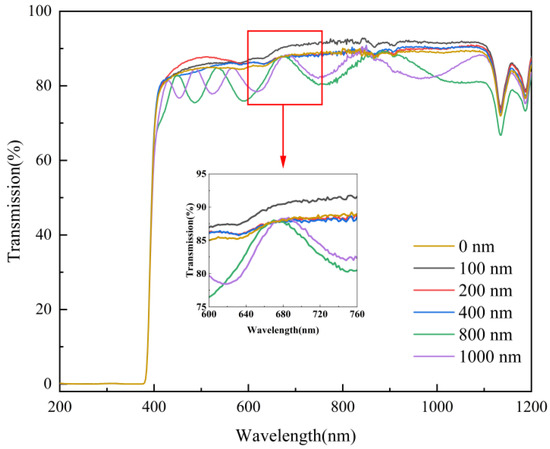 The films were tested for optical transmittance using a UV-VIS spectrophotometer to characterize the optical properties of mineral hydrophilic anti-fog films with different layer thicknesses. Figure 7 shows the optical transmittance of film samples with different layer thicknesses. It can be seen from Figure 7 that in the visible region of 400–760 nm wavelengths, the film sample with a film layer thickness of 100 nm had the highest transmittance of up to 92.2%. This is 4.5% higher than that of the blank substrate. The film samples with a film layer thickness of 200 and 400 nm had a similar transmittance of about 88%. In the wavelength range of 530–660 nm, the transmittance was about 3% higher than that of the blank substrate. This indicates that the mineral hydrophilic film does not affect the light transmission performance of the original substrate material, and the film layer has a specific optical permeability effect on the original substrate material. When the thickness of the film layer reached 800 and 1000 nm, the optical transmittance of the film samples fluctuated wildly. During the coating process, the silicate mineral material was randomly deposited on the substrate. Optical transmittance is influenced by the thickness and uniformity of the nano-mineral particles deposited on the surface of the substrate, which leads to decrease of the optical transmittance of the film. In the infrared range above 760 nm, the best optical transmittance was achieved for the 100 nm layer thickness, followed by the 200 and 400 nm thicknesses, while the worst visual performance was found for the 800 and 1000 nm thicknesses.