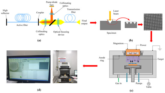 Process flow. (a) Principle of Fiber Laser, (b) Microtexture preparation, (c) Coating Thickness Measuring Instrument, (d) Principle of Vapor Deposition.