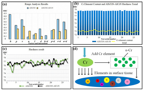Hardness test results and the action mechanism. (a) hardness test range analysis results, (b) Cr element content and AlSiTiN–AlCrN hardness trend, (c) hardness test results, (d) the schematic diagram of Cr element addition.