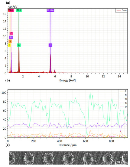 The elemental composition of the material surface was analyzed using X-ray energy dispersive analysis (EDS), as shown in Figure 4. The upper part represents the EDS spectrum of the AlSiTiN–AlCrN coating, and the lower part is the line-scanning analysis of the elemental content. The Al content inside the micro-pits is much lower than outside because Al easily reacts with O to form a thin film of chemically stable Al2O3 on the surface. The content of other elements inside and outside the micro-pits does not show a significant difference. The content of C is positively correlated with the Cr content, i.e., areas with a high Cr content also exhibit more C than other areas. Since Cr is a strong carbide-forming element, it strongly reacts with carbon and can form special carbides under appropriate conditions if there is enough carbon. In the absence of carbon, it dissolves into a solid atomic solution, and Cr inhibits carbon graphitization.