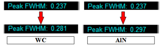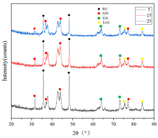 The value of k is related to the definition of β, usually 0.89. The constant k, X-ray wavelength λ and diffraction angle θ are fixed values. When the half width and height β increase, the grain size D decreases. It can be seen from Figure 8 that the addition of Cr element increases the full width at half maximum of AlN and WC peaks, so the grain size of AlN and WC decreases and the crystal strength increases.