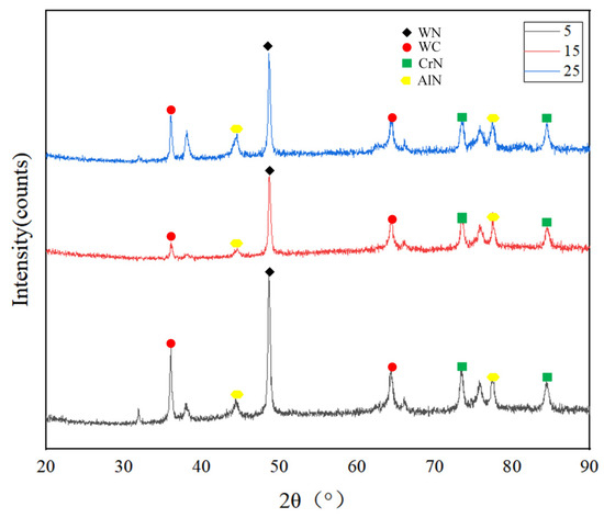 The experimental results of the groups of the two coatings were selected for the XRD phase analysis, and the obtained XRD patterns are shown in Figure 5 and Figure 6. The main peak of the AlSiTiN coating is the WC peak because W is a stronger carbide-forming element than Cr, and it readily forms a compound when the C content is small, so W and C are the main constituting elements of the matrix. By comparison, the addition of Cr causes the replacement of Al and Ti nitrides by CrN. The α-Cr phase in the microstructure gradually changes from the granular to lamellar structure with the Cr content, which is related to the Al and Ti nitride eutectic structures in the layer, reducing the contents of Al and Ti [14]. The number of electrons in the outermost shell of Cr is 1, whereas the number of electrons in the outermost shell of Al and Ti is 2. Cr and Ti belong to the same period, and the number of electrons of Cr is greater than of Ti, so the electrons of Cr more easily combine with non-metallic elements to form final compounds. When Al, Ti and Cr coexist in the structure, C and N preferentially react with Cr electrons, hindering Al and Ti’s interaction with non-metals to form final compounds, as shown in Figure 7.