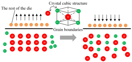 Since the atomic radius of Cr is larger than that of Al, the sign of the misfit degree of Al and Cr in the matrix is opposite. Al reduces the distortion energy in the matrix so that the tendency of these atoms to segregate at grain boundaries and other regions is reduced. Al has slightly lower segregation energy than Cr, indicating that Al occupies the grain boundary positions more preferentially than Cr. When it increases, the segregation energy of Cr becomes negative, and Cr preferentially occupies the grain boundary positions. Regardless of the chemical or mechanical effect, Al weakens grain boundaries and behaves as a brittle impurity, whereas Cr exhibits different behavior. Cr exerts a stronger chemical effect on grain boundary strengthening, whereas its mechanical effect weakens grain boundary bonding. Altogether, Cr can enhance grain boundary bonding and behaves as a tough impurity. When the content of Cr increases, its ability to enhance the bonding of grain boundaries is more prominent. The effect of Al weakening of grain boundaries is offset, and the grains in the microstructure combine at the grain boundaries under the action of Cr, thus realizing the overall grain boundary. In refinement, the peak intensity of each phase successively decreases, as shown in Figure 9. This phenomenon indicates that Cr can keep Al away from the grain boundaries, reduce the peak height of the AlN phase and the grain size of the Al compound and realize grain refinement. The toughness of the composite coating is enhanced, the brittleness is reduced, and the surface properties of the alloy coating are improved. This is consistent with the conclusion that the Cr element in the steel increases and the strength increases in the literature [16].