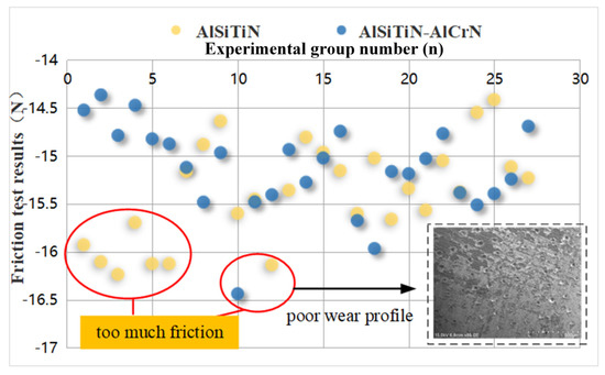 The friction force resulting from the friction and wear tests is shown in Figure 11. The friction force of the 27 groups of AlSiTiN coatings is generally greater than that of the AlSiTiN–AlCrN coatings, and the average value of the friction force data of the two coatings is also lower than that of the Cr-containing coating. This shows that the surface of the composite coating exhibits better wear resistance after adding an appropriate amount of Cr.